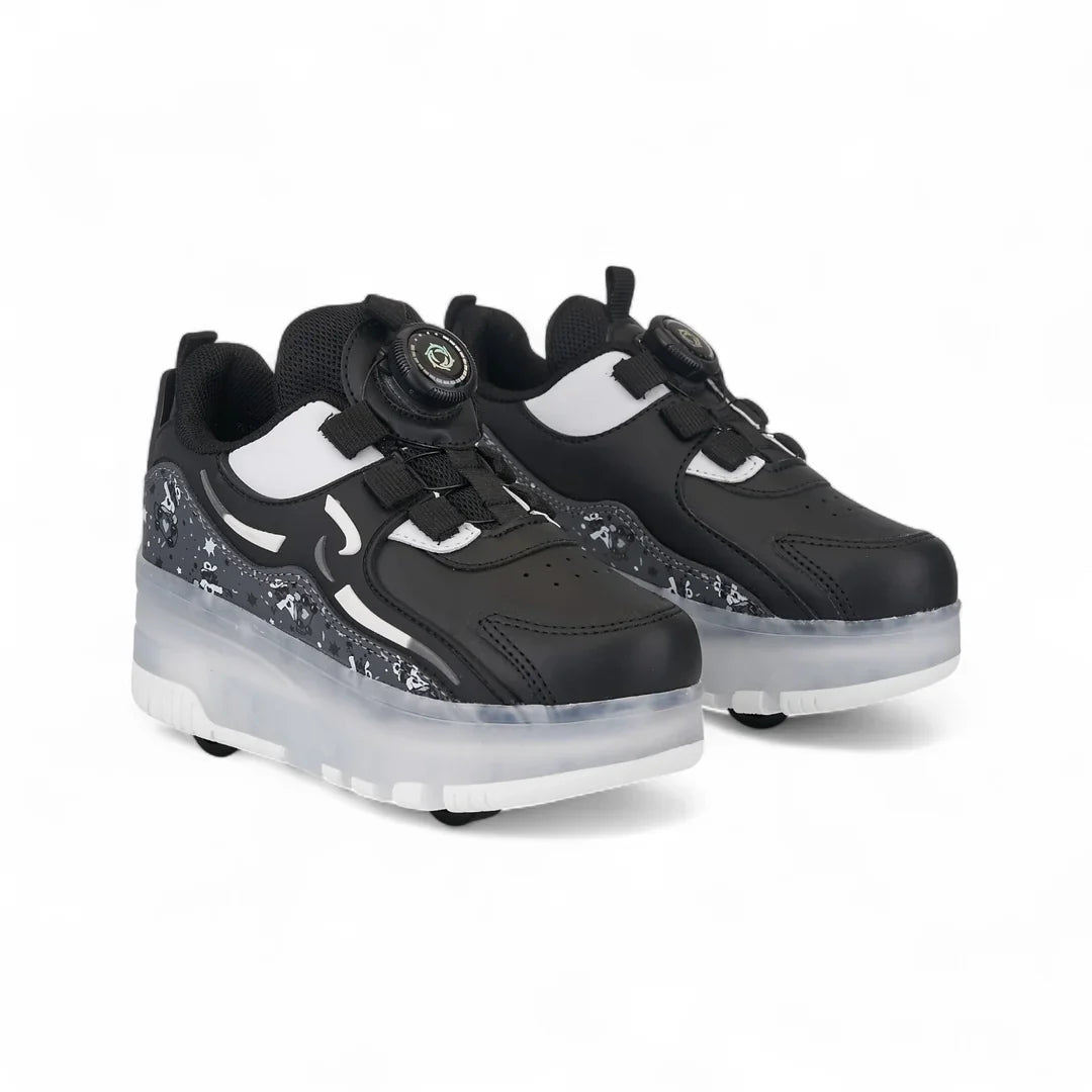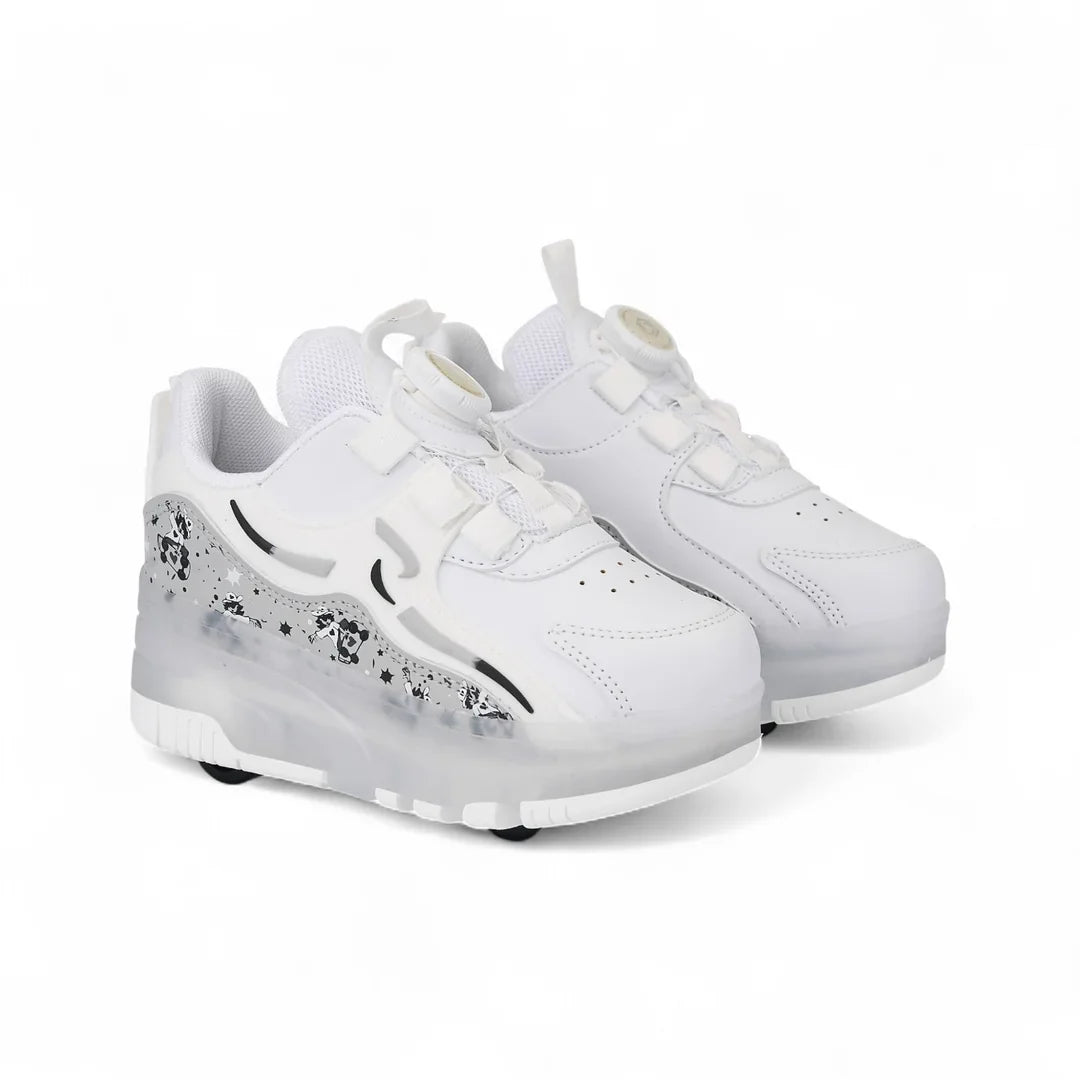 Ayakkabının tabanına entegre olarak yerleştirilebilen, önde iki ve arkada iki olmak üzere toplam dört tekerlek; kolay takılıp çıkarılabilir mekanizmasıyla yüksek kullanım pratikliği sağlar. Çocuklar dilediklerinde ayakkabıyı patenli ayakkabı olarak kullanabilir, dilediklerinde ise tekerlekleri çıkararak gün boyunca rahat bir çocuk spor ayakkabı deneyimi yaşayabilir. Esnek ve ortopedik taban yapısı konfor sağlarken, dayanıklı malzemesi güvenli bir kullanım sunar.